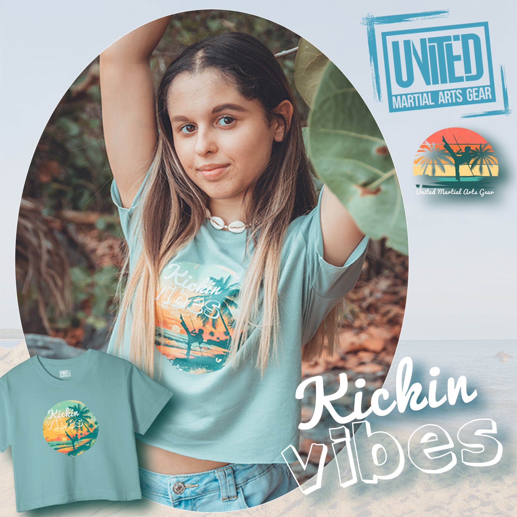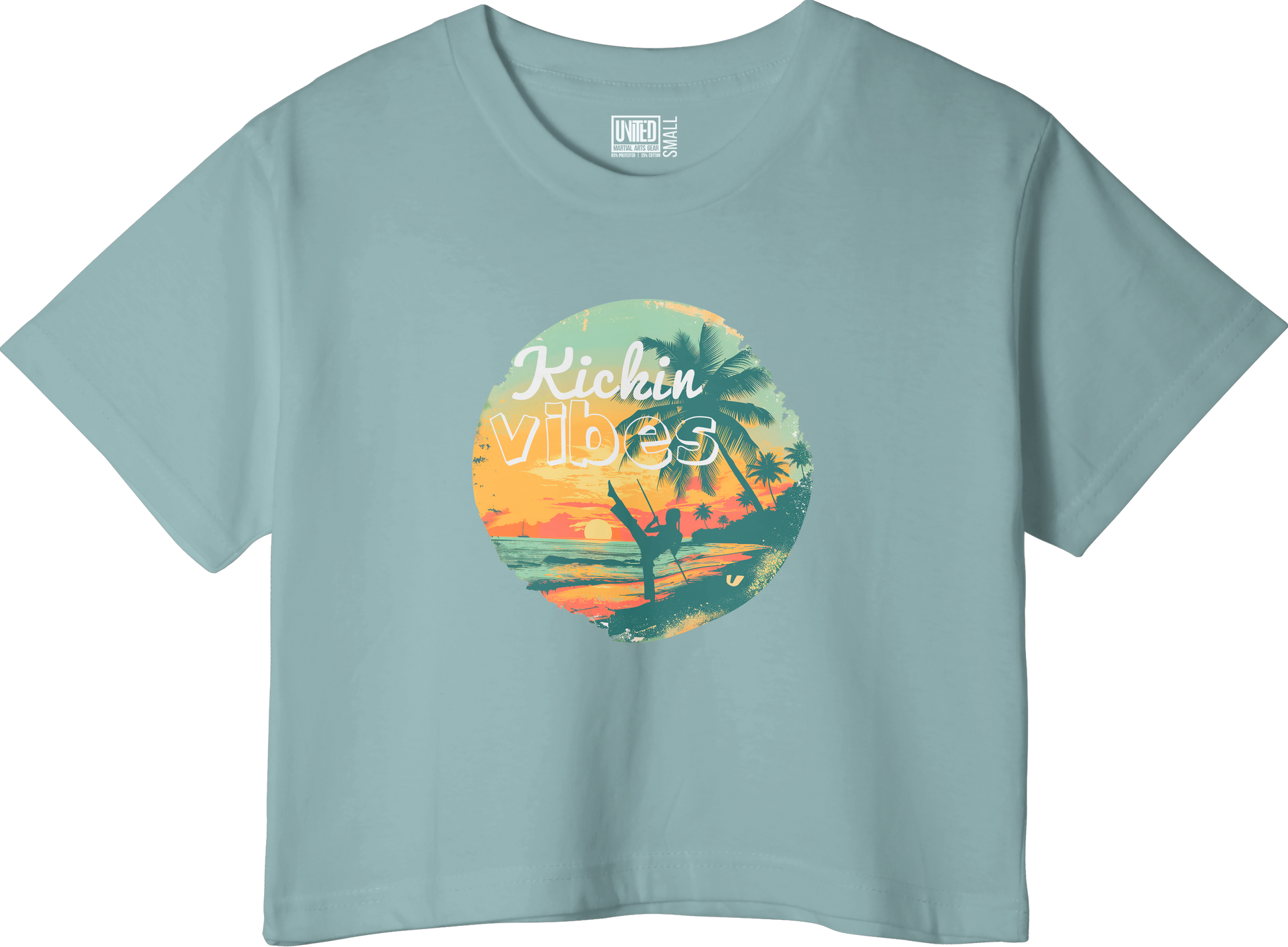 Feel the power, freedom, and flow with our Kickin Vibes crop top — where martial arts meets beach life. This bold and breezy tee features a dynamic martial artist kick, silhouetted against a sun-soaked beach scene. Whether you're throwing kicks or catching rays, this top brings high energy and laid-back style together in perfect harmony